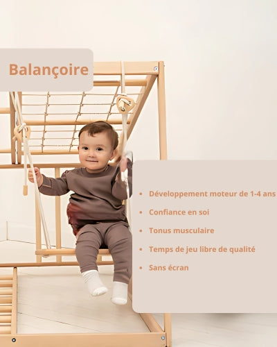 L'aire de jeu d'Intérieur est plus qu'un jouet, c'est un investissement dans le bien-être et le développement de votre enfant. Sécurisée, esthétique, durable et Montessori, c'est l'outil parfait pour offrir à votre enfant un espace de jeu complet et évolutif utile à son développement moteur, cognitif et sa confiance pendant plusieurs années.