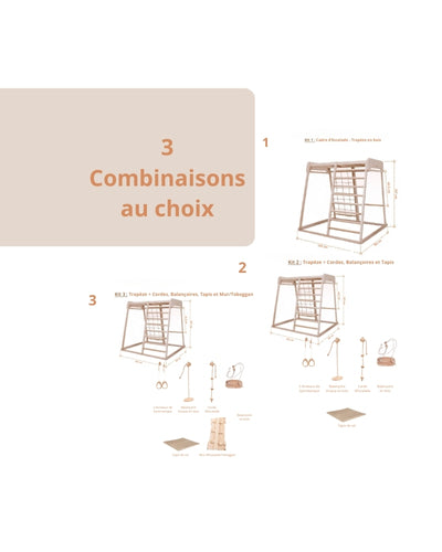 - Trapèze avec cordes et balançoires + tapis + rampe d'escalade/toboggan : La version ultime pour un jeu dynamique évolutif jusqu'à 5 ans.