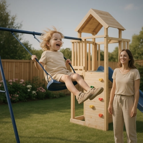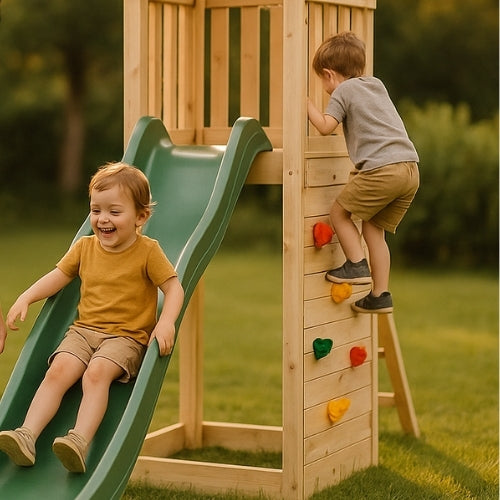 Aire de jeux extérieur en bois pour enfant 3-8 ans – Balançoire + Toboggan + Mur d’escalade - Livraison Rapide