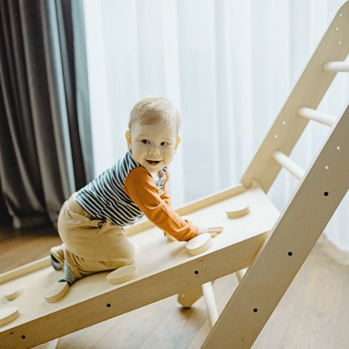 Transformez chaque jour en une aventure Montessori pour votre enfant. Stimulez son développement moteur et son imagination avec notre aire de jeu 7-en-1 : Triangle Pikler, Arche et Rampe, Echelle, Escalade, Toboggan, Tunnel/Cabane. Pour lui offrir un espace sécurisé où l'autonomie s'épanouit.