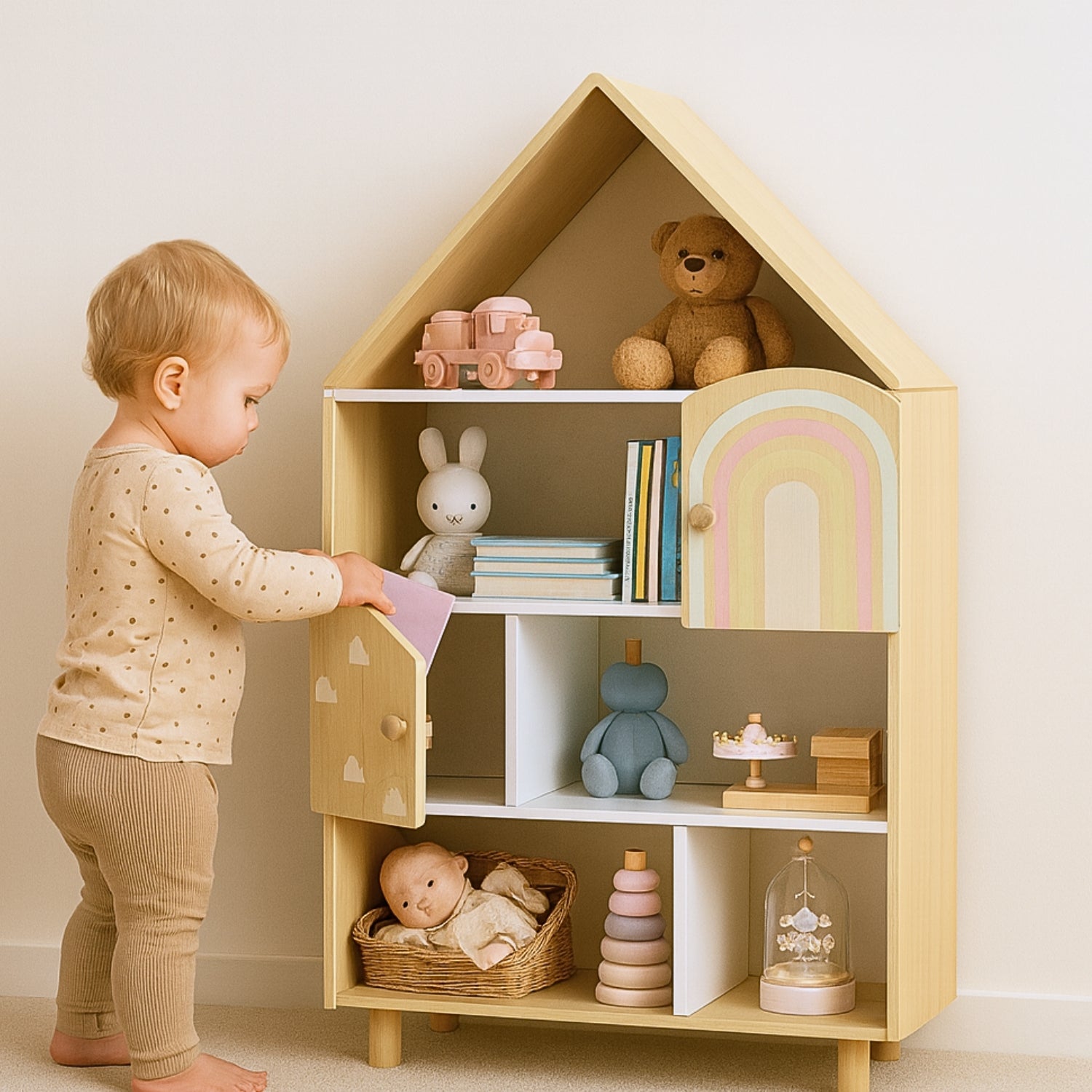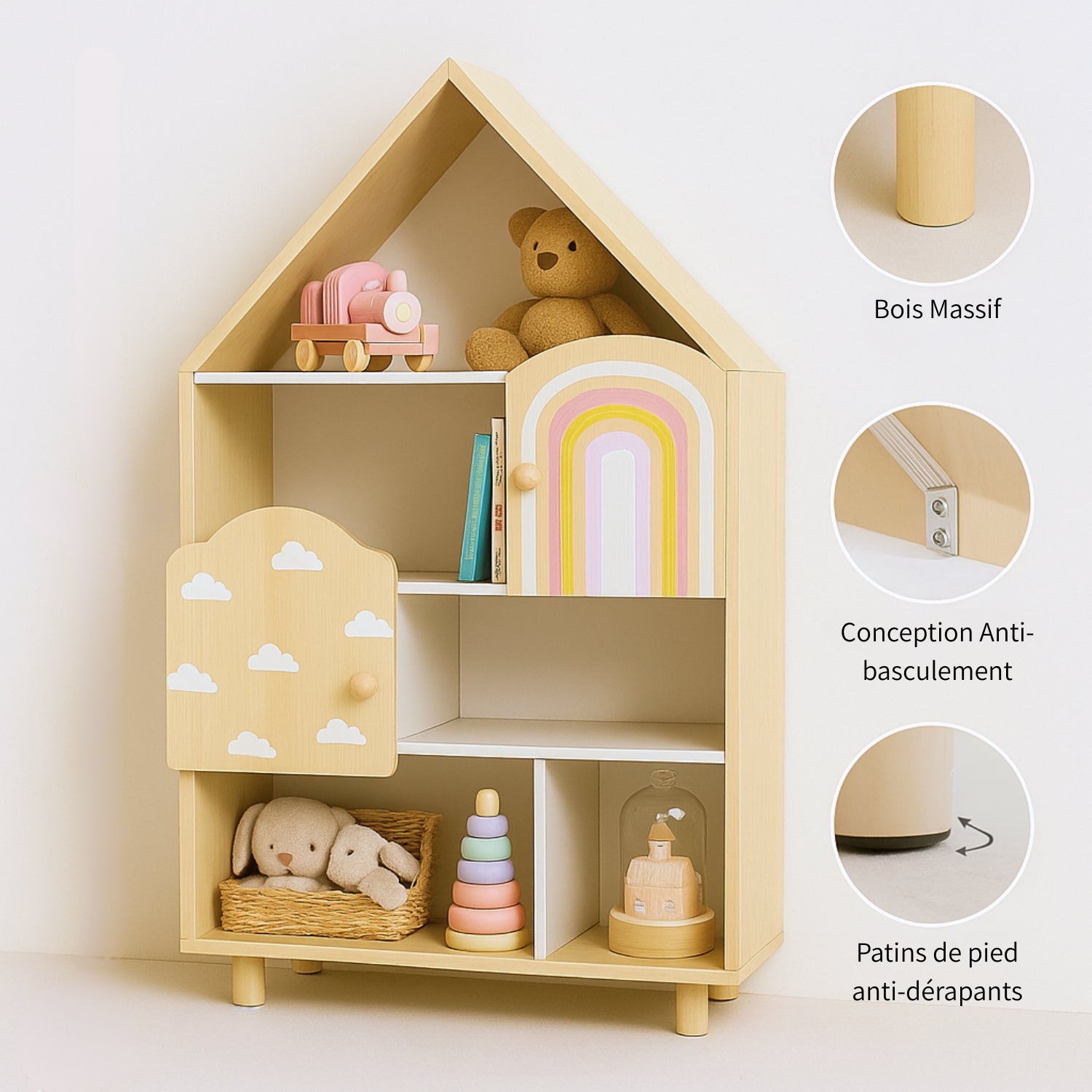 - Autonomie sollicitée naturellement : niches ouvertes + 2 petites portes (nuage & arc-en-ciel) pour offrir l'occasion de jouer au “je range tout seul”.