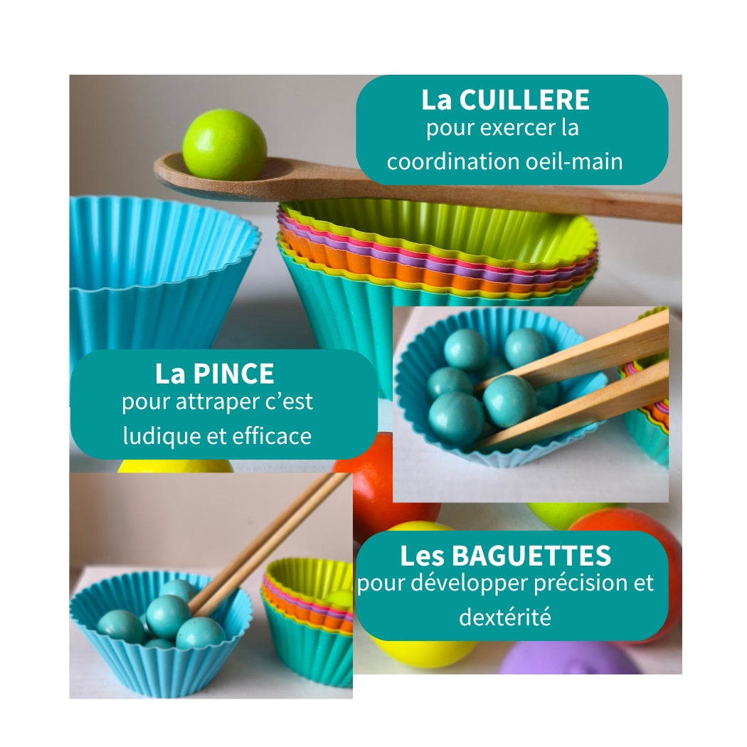 Le jeu comprend des perles colorées en bois, un kit de 3 outils en bois pour manipuler les perles - pince, cuillère et baguettes - un plateau de tri avec des zones pour organiser les couleurs et les formes, une notice d'activités et défis regroupés en 3 niveaux de difficultés.