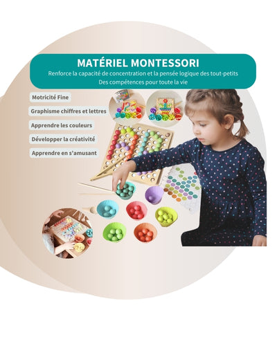 Le jeu permet à l'enfant de trier les perles par couleur et de reproduire des formes, améliorant sa capacité à associer et identifier visuellement des éléments, mémoriser les graphismes tout en renforçant sa coordination motrice.