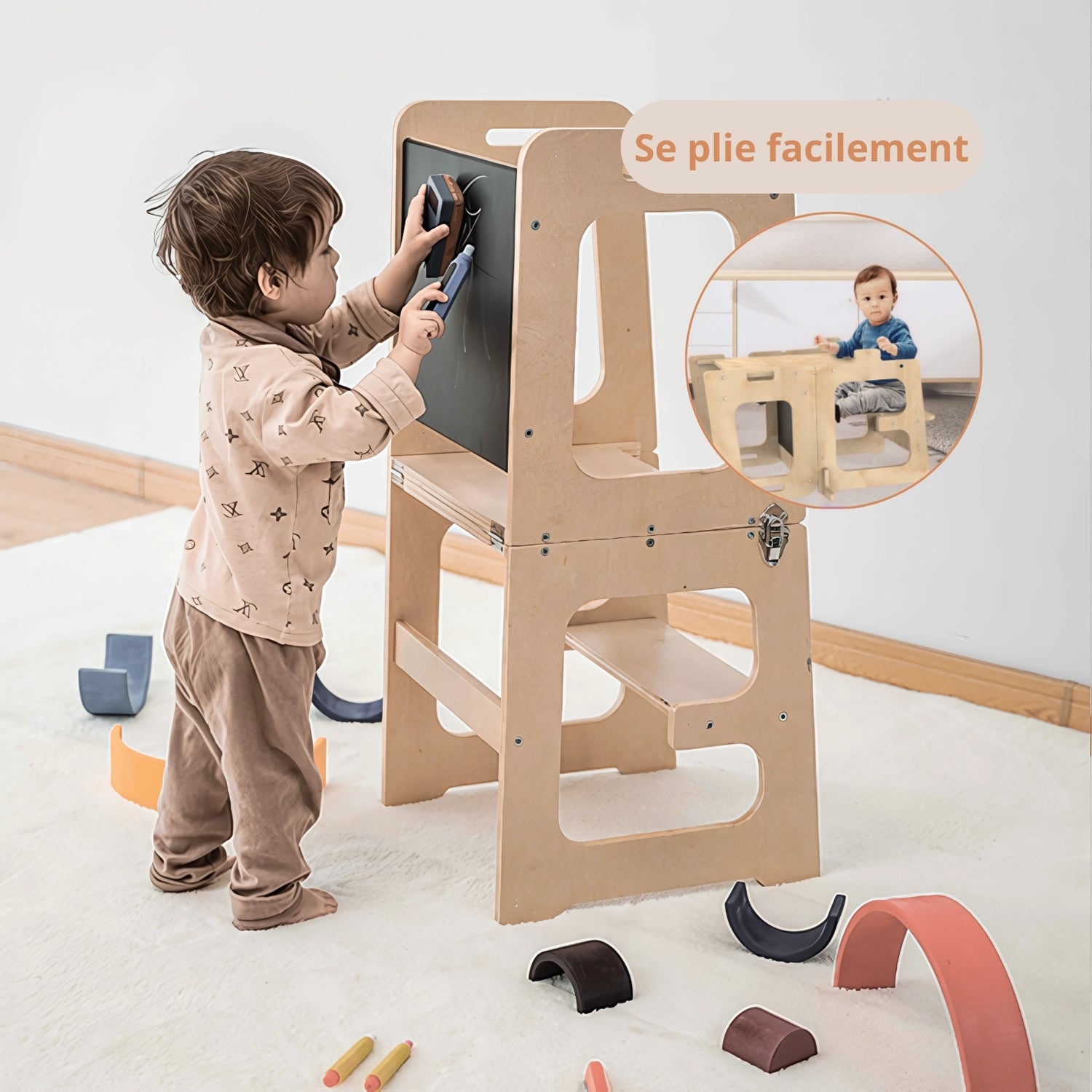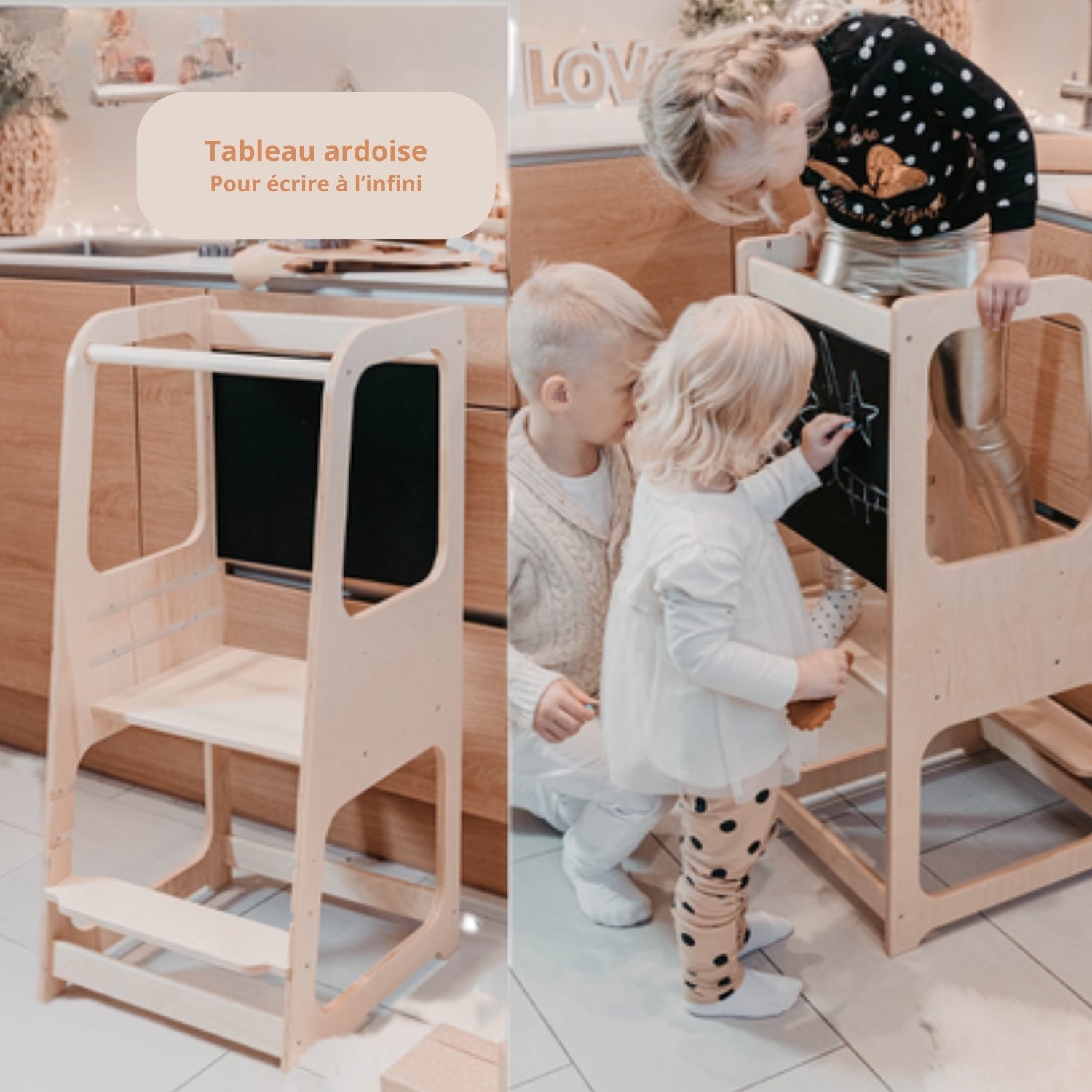 Cette tour d'observation se transforme en mini table ou tableau noir pour dessiner, sa créativité, apprendre à écrire ! Elle grandit avec votre enfant et s'adapte à ses besoins au jour le jour dans la cuisine, en atelier ou dans la salle de bain.
